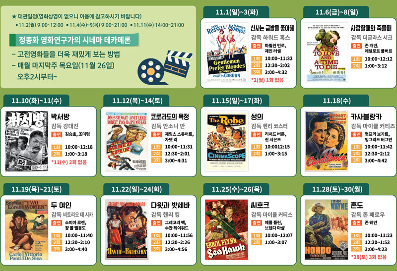 저녁에 고전영화를 보러와서 실망하고 발길을 돌리던 분들이 종종 있었습니다. 그런 분들을 위해 고전영화 저녁특별상영을 매월 1~2회씩 진행하려고 합니다. 대망의 첫 작품은 험프리 보가트, 잉그리드 버그만이 출연하고 마이클 커티스가 만든 1942년작 <카사블랑카>입니다! 상영일자 : 11월 18일(수), 25일(수) 상영일시 : 19:30 ~ 21:12 (102분) 사전진행 : 19:10 ~ 19:25 (신안수 문화기획자) ![]() 고전영화 상영일정 걸어다니는 영화백과사전 정종화 영화연구가의 시네마 데카메론이 이번달에도 마지막주 목요일(11월 26일 오후 2시)에 진행됩니다. 고전영화를 더욱 재밌게 보고 싶은 분들의 많은 관심 바랍니다.😉 (사진을 누르면 크게 보실 수 있습니다.) 한일영상문화교류 must go on! 일본국제교류기금 서울문화센터와의 협력으로 꾸준히 일본과의 문화교류를 이어왔던 미림극장이 올해도 그 흐름을 이어갑니다. (정말로 꾸준히 했더니 NHK 인터뷰도 하게 되었네요.😎) 5월부터 10월까지 매월 마지막주 토요일에 진행되었던 일본영화상영회가 시즌2로 11월부터 내년 3월까지 흐름을 이어갑니다. ![]() 11월에는 <남극의 쉐프>로 미림극장을 찾아주었던 오키타 슈이치 감독의 작품 <모리의 정원>으로 찾아옵니다! 일시 : 11월 28일 토요일 오후 3시 상영시간 : 99분 주연 : 야마자키 츠토무, 키키 키린 관람료 : 무료 상영 후에는 이 영화를 수입배급한 영화사 진진의 정태원 차장과 함께 영화에 대한 이야기를 나누는 시간이 있으니 놓치지 마세요! 2020 인천시네마🎬 로드쇼 인 재팬! 미림극장이 비대면 사회를 맞이해 새롭게 알게된 ZOOM을 활용하여 개인과 개인을 넘고 바다를 건너 일본의 예술영화관들을 연결합니다! 이번엔 인천이 배경이거나 인천사람들이 만든 인천단편영화 5편을 미림극장과 일본커뮤니티시네마센터 소속 예술영화관들이 오프라인으로 동시에 영화를 감상하고 관람이 끝나면 ZOOM을 활용하여 영화를 만든 분들과 접속한 일본의 관객들의 반응을 실시간으로 함께 감상하실 수 있습니다! [상영작] 보호자(2020. 22분, 감독:정혜원) 뒤로 걷기(2020, 32분, 감독 방성준) 싫다는게 아니라(2020, 27분, 감독:주영) 갤럭시 아이즈(2020, 17분, 감독:이민섭) 연출자를 모집합니다(2019, 22분, 감독:신용희) [상영일정 및 상영관] 11월 14일(토) 오후 5시 [온라인 활용 관객과의 대화] 오후 7시 [참여 극장]