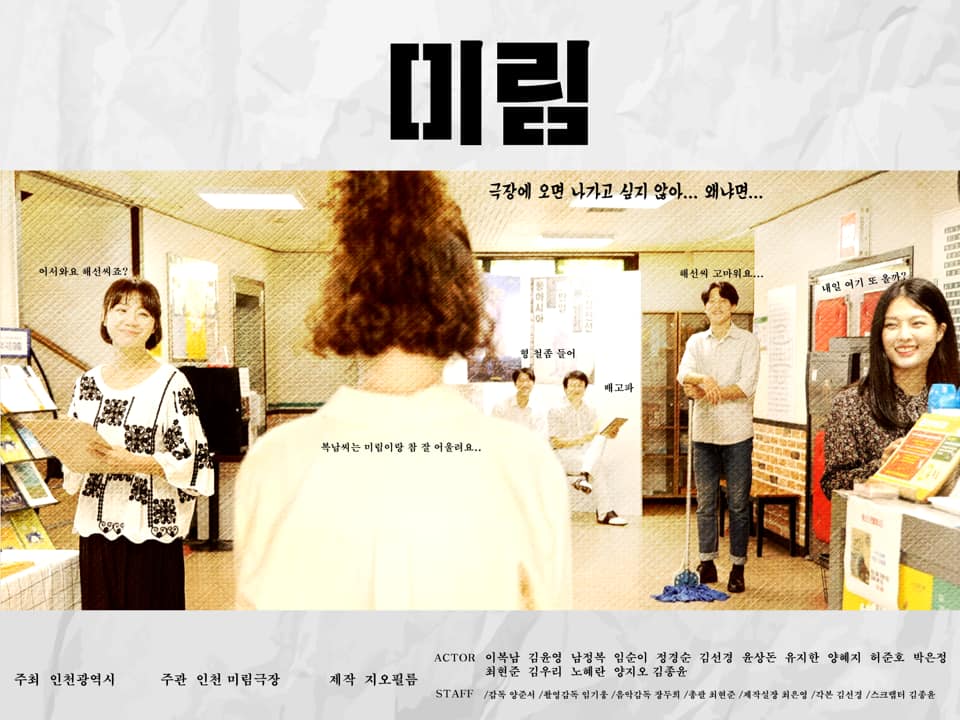 조나단 스위프트 작가의 풍자 소설 걸리버 여행기를 토대로 관객참여이동형 연극이 미림극장 곳곳에 숨어들어 극장을 여러가지로 재해석해낼 예정입니다. 또한 인간성의 대한 고찰을 다양한 시각으로 바라보는 계기가 될 수 있을 것입니다. 공연일시: 11월 5일 오후 6시, 8시(2회) 관람시간: 대략 40분 문의사항: 010-3166-9896 동시관람가능인원 : 10명 >관람신청하기< ![]() ![]() 11월 7일 오후 4시, 미림에서 제작된 단편영화가 여러분을 찾아옵니다! 미림의 연극프로그램으로 잔뼈가 굵은 어르신 배우님들이 현역 배우들과 호흡을 맞춰서 상영시간 25분의 트로트 뮤지컬 영화를 만들어냈습니다! 미림극장에서 벌어지는 이야기를 환상적인 이야기로 펼쳤다하니 오후 1시에 고전영화도 보시고 4시에 진행되는 본 영화도 함께 관람하심이 어떠실까요? 😉 본 행사는 인천광역시청의 천개의 문화오아시스사업의 지원을 받아(와, 시스형!) 진행된 개봉박두, 사운드 오브 뮤지-컬! 프로그램의 일환으로 진행됩니다. 미림극장 창업주인 고은진 사장이 1965년 산동네인 송림동 주민들을 위해 사비로 계단을 만들어줬던 것처럼 2013년 새로 태어난 인천미림극장은 문화예술을 통해 세대를 잇고 지역과 시민을 엮어가고 있습니다. 코로나 시대, 온라인이란 비대면 방식이 여전히 어려운 분들을 위해 오늘도 극장 문을 여는 미림극장을 곁에서 응원해주시길 부탁드립니다. 미림의 숲을 키워주시는 버팀목 회원분들 감사합니다! 함께海(인천 해양수산 상생협의체) 윤성구 심옥빈 국민은행숭의동지점 김병균 엄옥선 민동미 전재성 조은성 라오미 이재선 백승오 조우리 최은영 김기회 신안수 장수연 김창현 이은희 이동진 김동진 이경옥 심현빈 김푸르나 동방상용 심준희 정연미 이장민 전춘우 임채주 유경철 윤두율 이성재 이형일 장미자 정춘자 최길성 최등영 최미영 곽진출 김면수 김병직 최정훈 한필남 김성배 김성운 김용구 김장회 김홍섭 박계홍 변현숙 서광일 안정복 유경재 황상희 황유경 최현준 조우길 유연준 고미네아끼라 박상찬 정명섭 최환 * 문화체육관광부 산하기관 '한국문화예술위원회'가 운영하는 CMS로 기부금영수증 발행이 가능합니다. * 후원하시는 분들 중 기업을 운영하시는 분은 요청하시면 성명대신 기업명으로 표시해드립니다. ![]() 인천광역시 동구 화도진로 31 (송현동) |