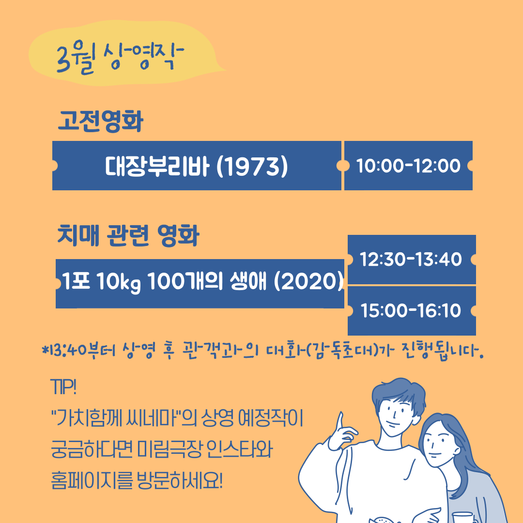 2021 봄이 열립니다 🌺 2021년 3월호 이제는 기지개를 켜고 움직일 시간 고전영화 상영일정 걸어다니는 영화백과사전 정종화 영화연구가의 시네마 데카메론이 이번달에도 3월 25일 목요일 오후 2시에 진행됩니다. 고전영화를 더욱 재밌게 보고 싶은 분들의 많은 관심 바랍니다.😉 관람료 정보 ![]() 2021년 1월부터 영화관람료가 인상되었습니다. 카카오톡채널 [미림극장]을 친구추가하신 분들은 행사안내와 함께 독립예술영화 할인혜택을 제공합니다. 고전영화 관람료