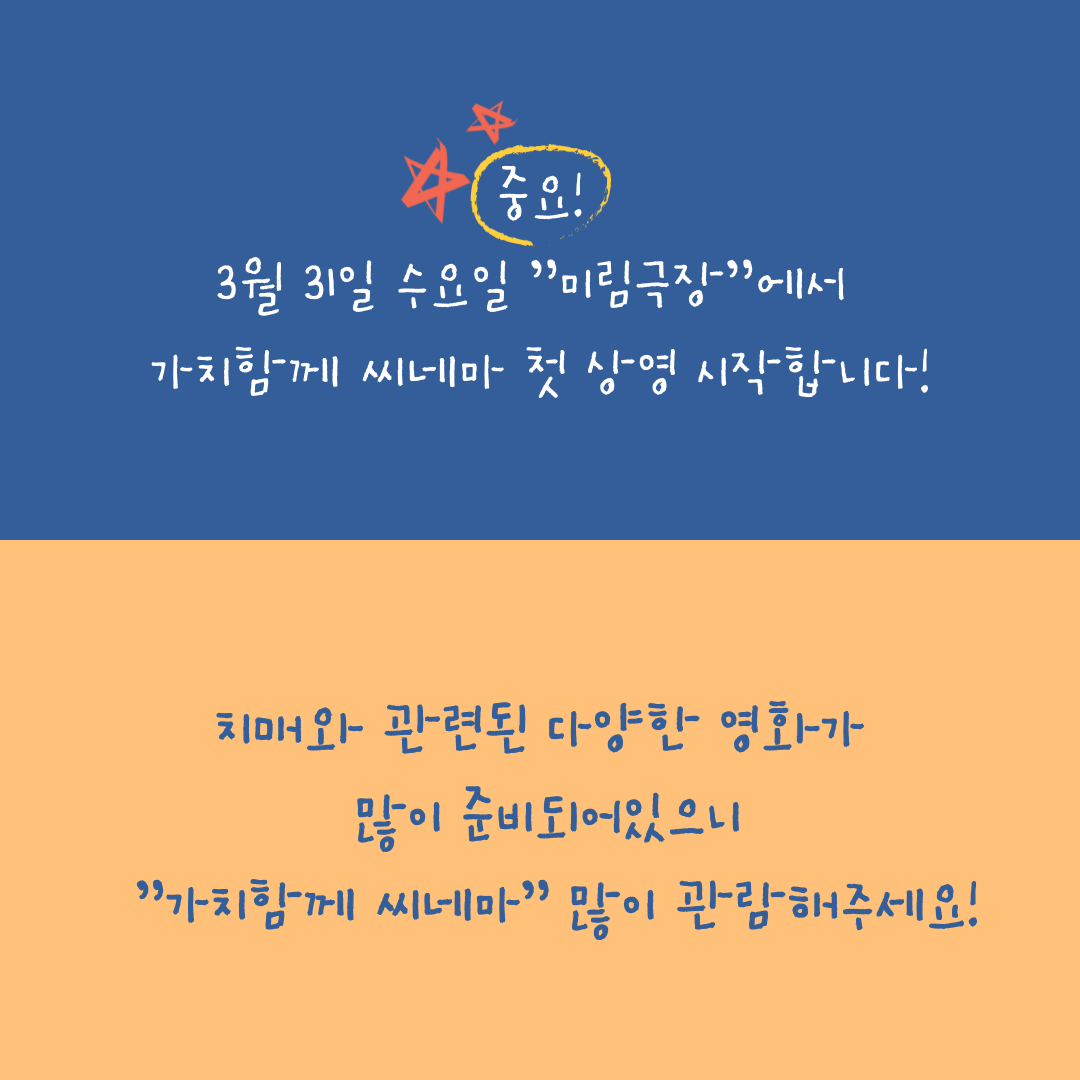 <우리 생애 최고의 순간>의 임순례 감독님이 만든 <리틀 포레스트>가 일본 원작을 리메이크한 작품이란 것 알고 계시나요? 3월에는 미림에서 <리틀포레스트2 : 겨울과 봄>을 만나봐요! 일시 : 3월 20일 토요일 오후 3시 상영시간 : 121분 주연 : 하시모토 아이, 마츠오카 마유 관람료 : 무료 ● 3월의 미림극장 독립예술영화 개봉소식! ![]() ![]() ![]() ![]() ![]() ![]() ![]() ![]() * 이 카드뉴스는 미림극장 대학생 서포터즈 미리미 1기 고은선, 박규원, 박지은, 서효경 네 분이 만들어준 컨텐츠를 활용하였습니다 :D 예술가와 시민을 연결하는 문화예술공간, 인천미림극장! 2월엔 어떤 일이 있었나요? ![]() 개봉영화 <요요현상> 관객과의 대화 내가 좋아하고 잘 하는 것으로 먹고 살 수 있을까? 2000년대 요요로 한국을 주름잡던 5명의 요요소년들의 꿈과 현실에 대한 이야기를 그린 다큐멘터리 <요요현상>의 관객과의 대화가 있었습니다. 요요의 메카, 요요의 도시 인천을 찾아준 <요요현상>의 고두현 감독님과 인천을 사랑하는 <인천스텔라>의 백승기 감독님이 만나서 맛깔난 대화를 나누었는데 이 날도 많은 분들이 찾아주셨습니다. 관객과의 대화 현장을 구경하고 싶은 분들은 아래 링크로! 😀 영상보기(1시간 길이 Full 영상) 일본영화상영회 <태풍이 지나가고> 태풍이 올라오는 와중에 이혼 후 아이를 위해 한달에 한번씩 만나는 가족의 어느 하루를 그린 영화죠. 가족의 이야기를 뚝심있게 만들어가는 고레에다 히로카즈 감독의 작품답게 그들의 감정선을 부드럽게 그려집니다. 2월에는 <보희와 녹양>의 안주영 감독님과 송진석 관객프로그래머님(영화공간사람들)이 관객 여러분들과 함께 영화에 대한 깊은 이야기를 나누었습니다! ![]() 미림극장 방문기 & 정종화 영화연구가의 '시네마 데카메론' 인터뷰 ![]() ![]() ![]() ![]() ![]() ![]() ※ 위 카드뉴스는 미림극장 대학생서포터즈 활동 중인 박규원 미리미가 만들어주었답니다😍 미림극장 창업주인 고은진 사장이 1965년 산동네인 송림동 주민들을 위해 사비로 계단을 만들어줬던 것처럼 2013년 새로 태어난 인천미림극장은 문화예술을 통해 세대를 잇고 지역과 시민을 엮어가고 있습니다. 코로나 시대, 온라인이란 비대면 방식이 여전히 어려운 분들을 위해 오늘도 극장 문을 여는 미림극장을 곁에서 응원해주시길 부탁드립니다. 미림의 숲을 키워주시는 버팀목 회원분들 감사합니다! 함께海(인천 해양수산 상생협의체) 윤성구 심옥빈 국민은행숭의동지점 김병균 엄옥선 민동미 전재성 조은성 라오미 이재선 백승오 조우리 최은영 김기회 신안수 장수연 김창현 이은희 이동진 김동진 이경옥 심현빈 김푸르나 동방상용 심준희 정연미 이장민 전춘우 임채주 유경철 윤두율 이성재 이형일 장미자 정춘자 최길성 최등영 최미영 곽진출 김면수 김병직 최정훈 한필남 김성배 김성운 김용구 김장회 김홍섭 박계홍 변현숙 서광일 안정복 유경재 황상희 황유경 최현준 조우길 유연준 고미네아끼라 박상찬 정명섭 최환 김영애(new!) 임순이(new!) 양진채(new!) 송진석(new!) 권오현(new!) 윤흥균(new!) 유사랑(new!) * 문화체육관광부 산하기관 '한국문화예술위원회'가 운영하는 CMS로 주민등록번호를 기입해주시면 홈택스를 통해 자동으로 기부금영수증이 발행됩니다. * 후원하시는 분들 중 기업을 운영하시는 분은 요청하시면 성명대신 기업명으로 표시해드립니다. 월간 미림 지난호 읽어보기 ![]() 인천광역시 동구 화도진로 31 (송현동) 인천 미림극장 홍보영상(2020) |